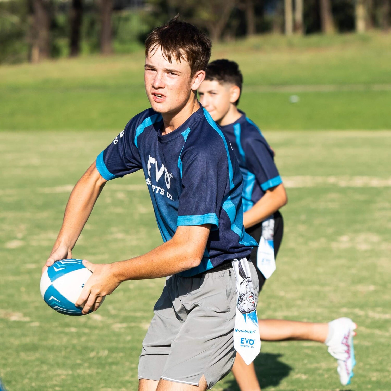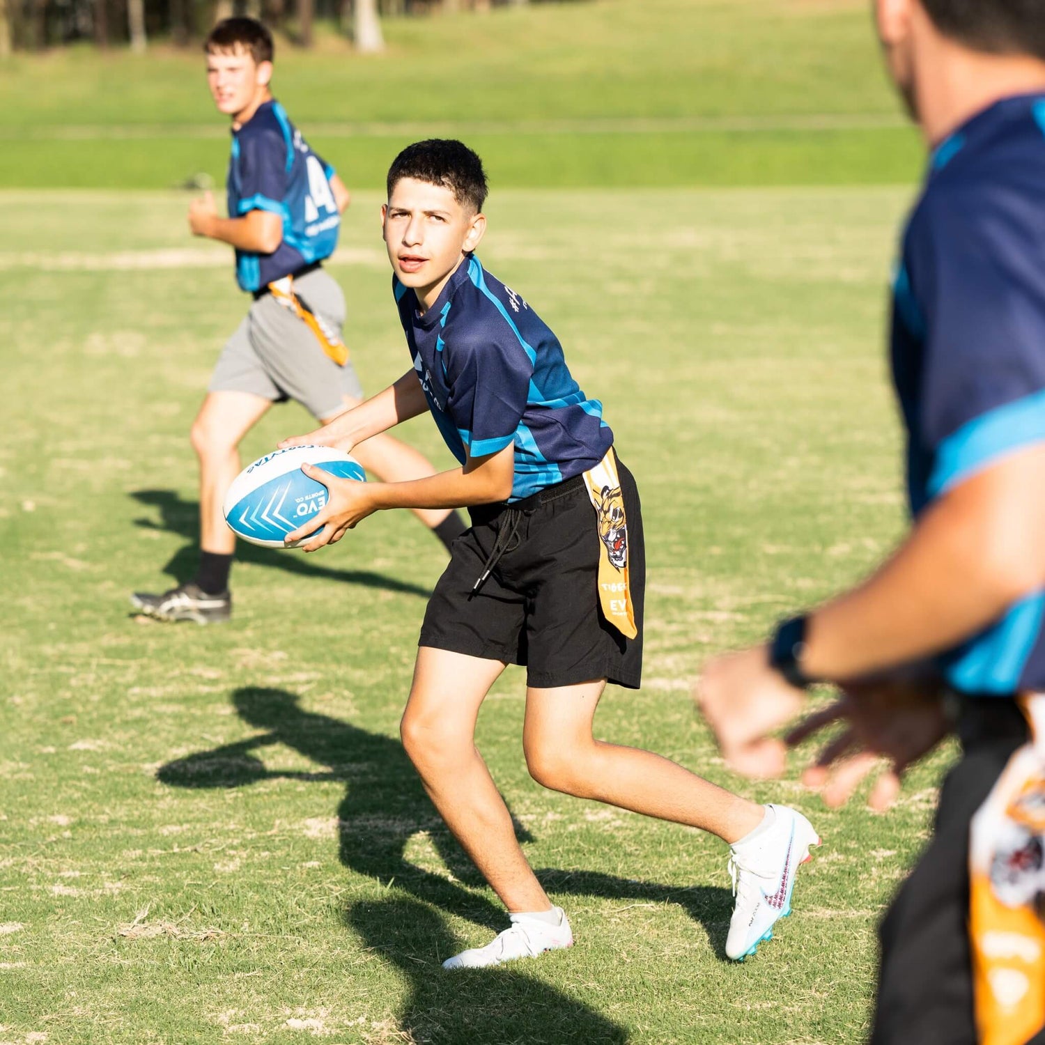 RugbyTag, recognised globally as Flag Football and OzTag, involves players wearing a pair of tags affixed with Velcro to shorts or belts. It follows rules similar to both Rugby and American Football.